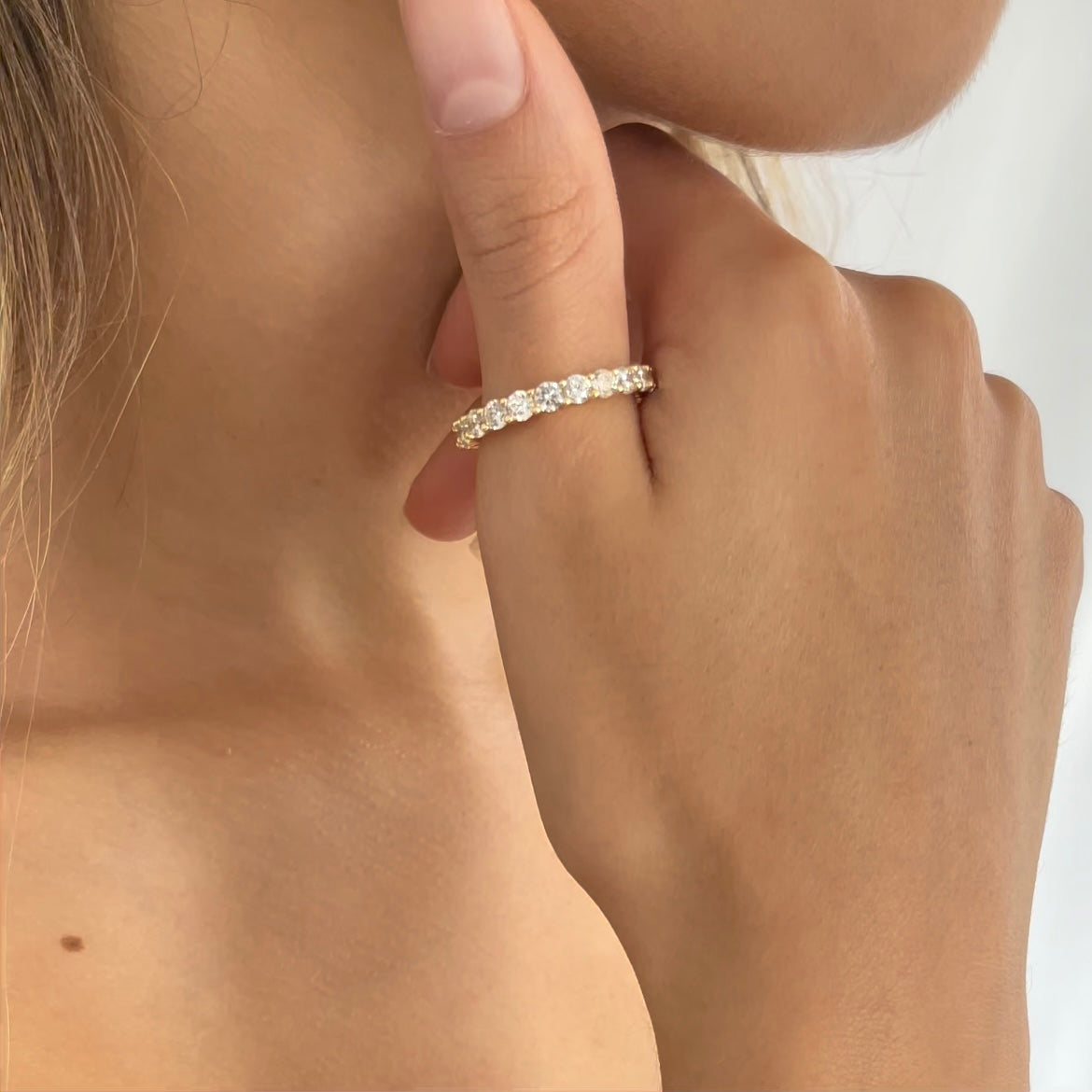 Splendid and elegant, this is how we present our golden Pure ring. This ring is made of high-quality materials. The cubic zirconia stones give it a special elegance and the 18 carat gold plating ensures durability and the highest quality at the best price. Each ring is lovingly designed by hand by the founder of the company and made only from carefully selected, sustainable materials. A piece of jewellery from us accompanies you in everyday life and is destined to last forever.