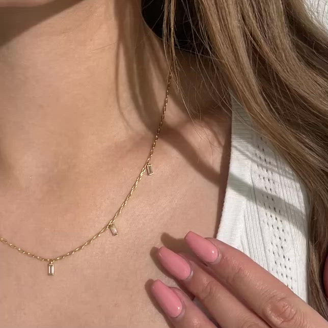 The Verona necklace is a stunning piece of jewellery set with five scattered baguette-cut cubic zirconia stones. The clear stones catch the light and make it dance, while the polished surface of the metal creates a shiny effect. The necklace is perfect for a glamorous appearance and goes with any outfit.